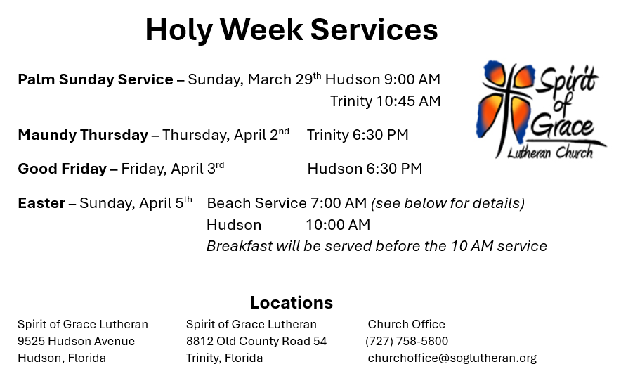 Spirit of Grace is part of the Evangelical Lutheran Church in America (ELCA) and is one congregation with two worshiping campuses – Hudson & Trinity.